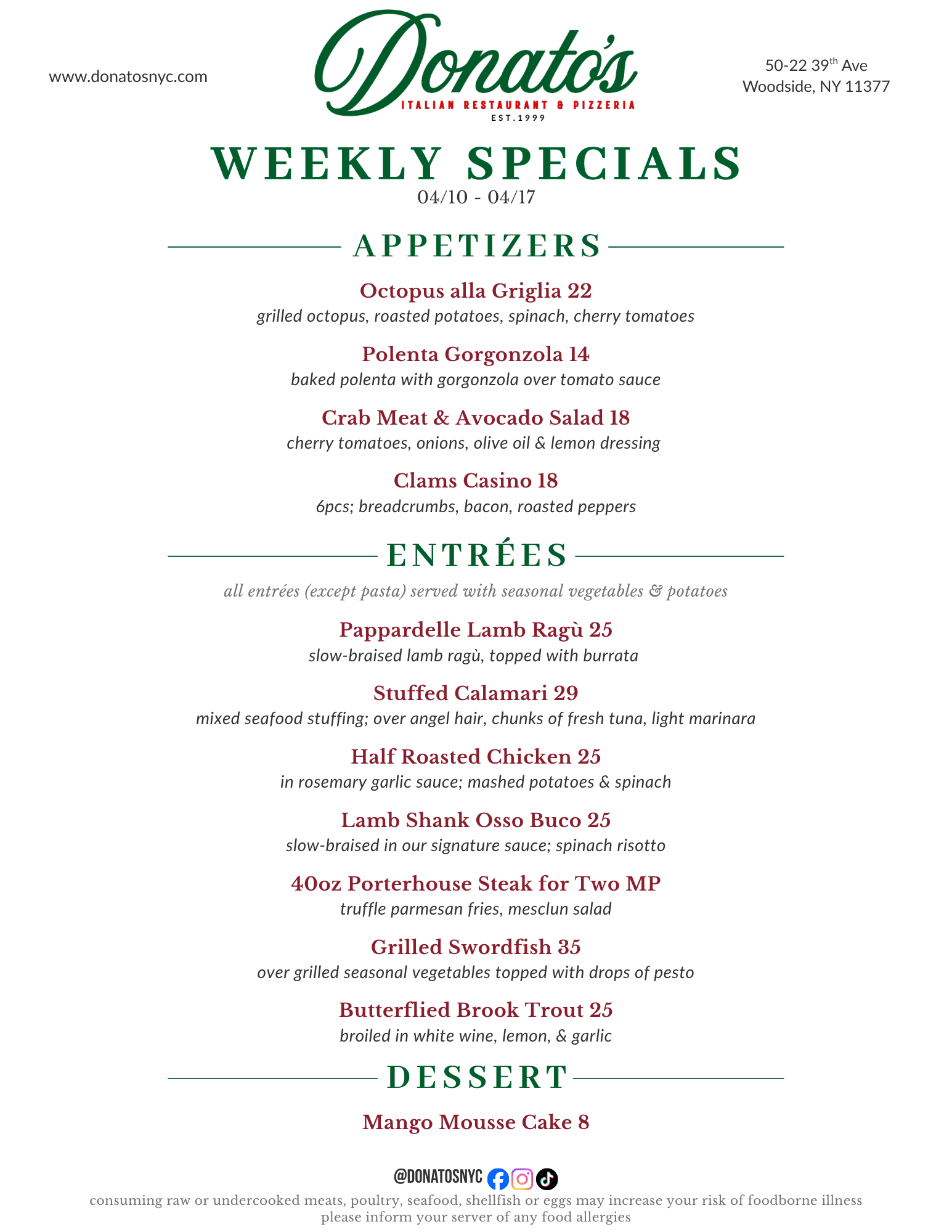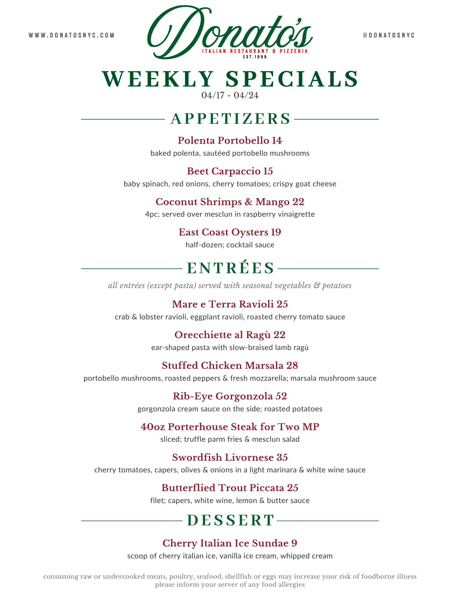 All entrees served over a choice of pasta in the same sauce: spaghetti, linguine, or ziti-